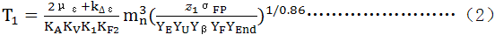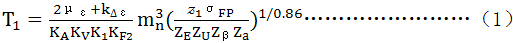 式(B2)與正文的公式(8)等效 ,其符号意義及取值同公式(8)。σHP及YF分别按大、小齒輪確定,σHP1/YF1和σHP2/YF2值,取其中的小值代入式(B2)。對於人字齒輪,(2με+k△ε)按單側齒寬計,算得的T1值爲單側齒寬的名義轉矩 。