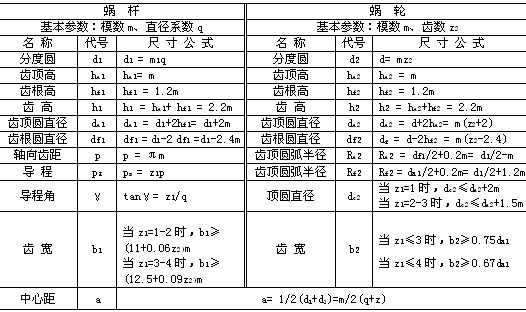 蝸杆蝸輪的主要參數有:模數m、蝸杆分度圓直徑d、導程角γ、、中心距a、蝸杆頭數z1、蝸輪齒數z2等,根據上述參(cān)數可決定蝸杆與蝸輪的基本尺寸,其中z1、z2由傳(chuán)動要求選定。幾何尺寸計算如下表所示。