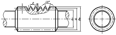 蝸杆一般選用一個視圖,其齒頂線、齒根線和分度線的畫法與圓柱齒輪相同,如下圖所示 。圖中以細實(shí)線表示的齒(chǐ)根線也可省略。齒(chǐ)形可用局部剖視或局部放大圖表示。