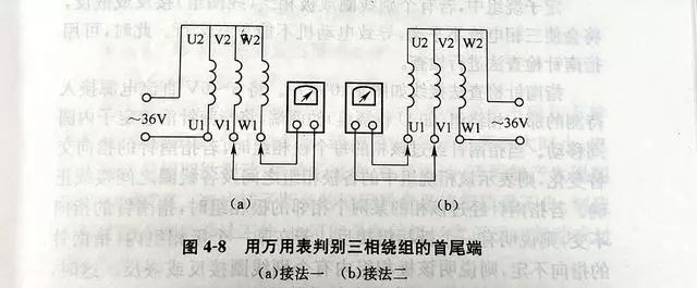 将三相繞組接成星形,從一相繞組接入36V交流電源,在另外兩相繞組的一端接入置於(yú)10V交流電壓擋的萬用表,按圖4-8(a)和(b)所示各接一次 。 通電後,觀察萬用表指針的擺動情況。若兩次萬用表指針均不動,則說明圖中所示的首尾端正確(què);若兩次萬用表指針都偏轉,則說明兩次均未接電源的那一相的首尾接反 ;若隻有一次指針偏轉,另一次指針不動,則說明指針不動的那一次中接電源的那一相首尾接反。