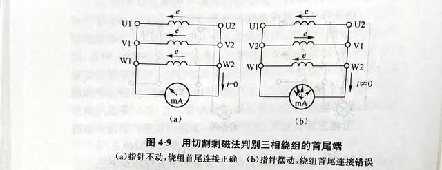 切割剩磁法是利用轉子鐵心中的剩磁在定子三相繞組中感應出電動勢,用萬用表指示出其回路中的電流值來檢查的。接線如圖4-9所示,用萬用表(毫安擋)進行測量。測量時用手轉動電動機的轉子,如果萬用表的指針不動,則說明三相繞組首尾連接是正確(què)的。即三相繞組的首端與首端連接、尾端與尾端連接。如果萬用表的指針來回擺(bǎi)動,則說明三相繞組連接有誤,應改接後重試。
