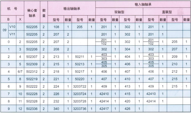擺線針輪減速機全套軸承型号明細表