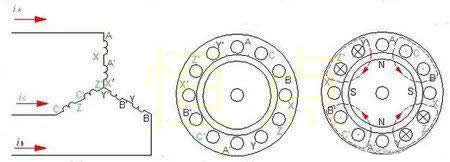 如果A、B、C三相繞組每相分别由兩個線圈串聯組成,每個線圈的跨距爲1/4圓周,那麽三相電流所建立的合成磁場仍然是一個旋轉磁場,並(bìng)且電流變(biàn)化一次,旋轉磁場僅轉過1/2轉,這就是2對極。同理,如果将繞組按一定的規則排列,可得3對極、4對極或一般地說P對極。P就是極對數。