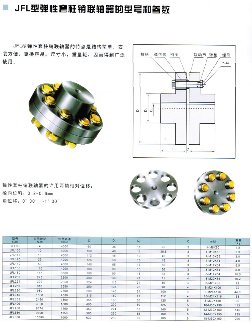 JFL型彈性套柱銷聯軸器的特點是結構簡單,安裝方便,更換容易,尺寸小,重量輕,因而得到廣泛使用。