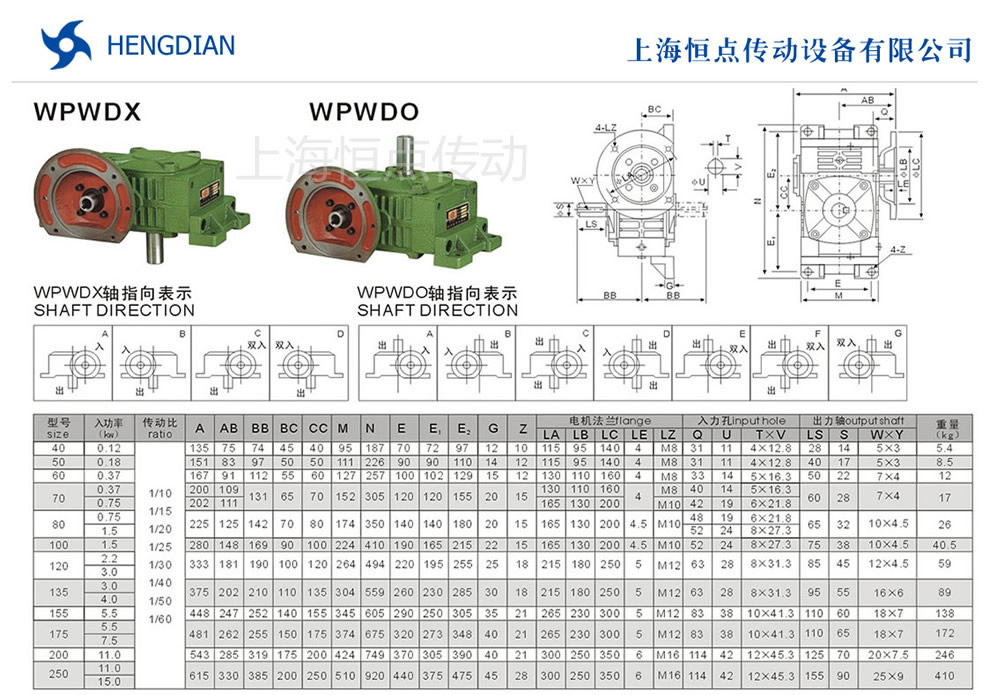 WPWDX與WPWDO蝸輪蝸杆減速機選型指南,WPWDX與WPWDO萬能型減速機法蘭輸入,軸輸出.WPWDX與WPWDO減速機軸指向表示方法.機座号40到250,速比10到60.WPWDX與WPWDO減速機的外形尺寸及安裝尺寸
