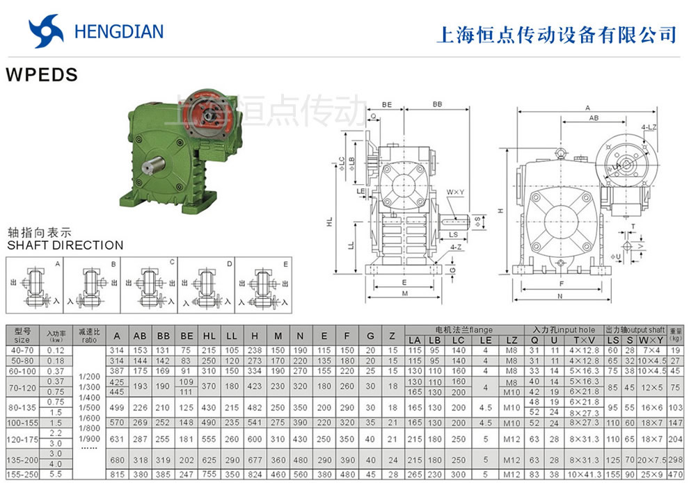 WPEDS雙級減速機的外形安裝尺寸.WPEDS雙級蝸輪蝸杆減速機選型指南,WPEDS雙級減速機法蘭輸入,軸輸出.WPEDS雙級減速機軸指向表示方法.機座号40-70到155-250,速比200到900.